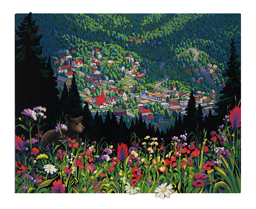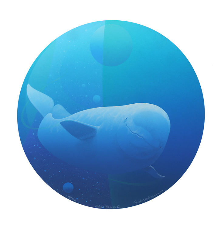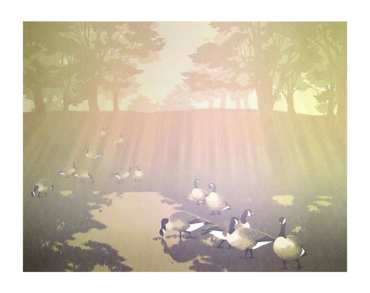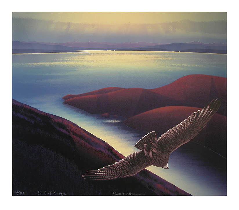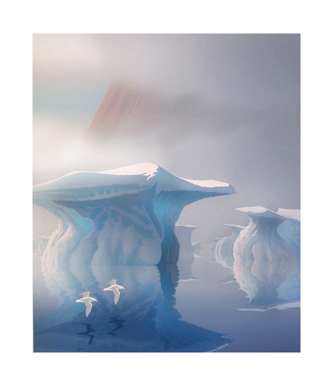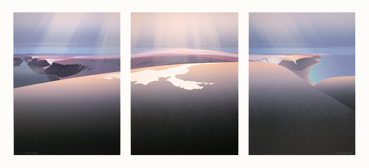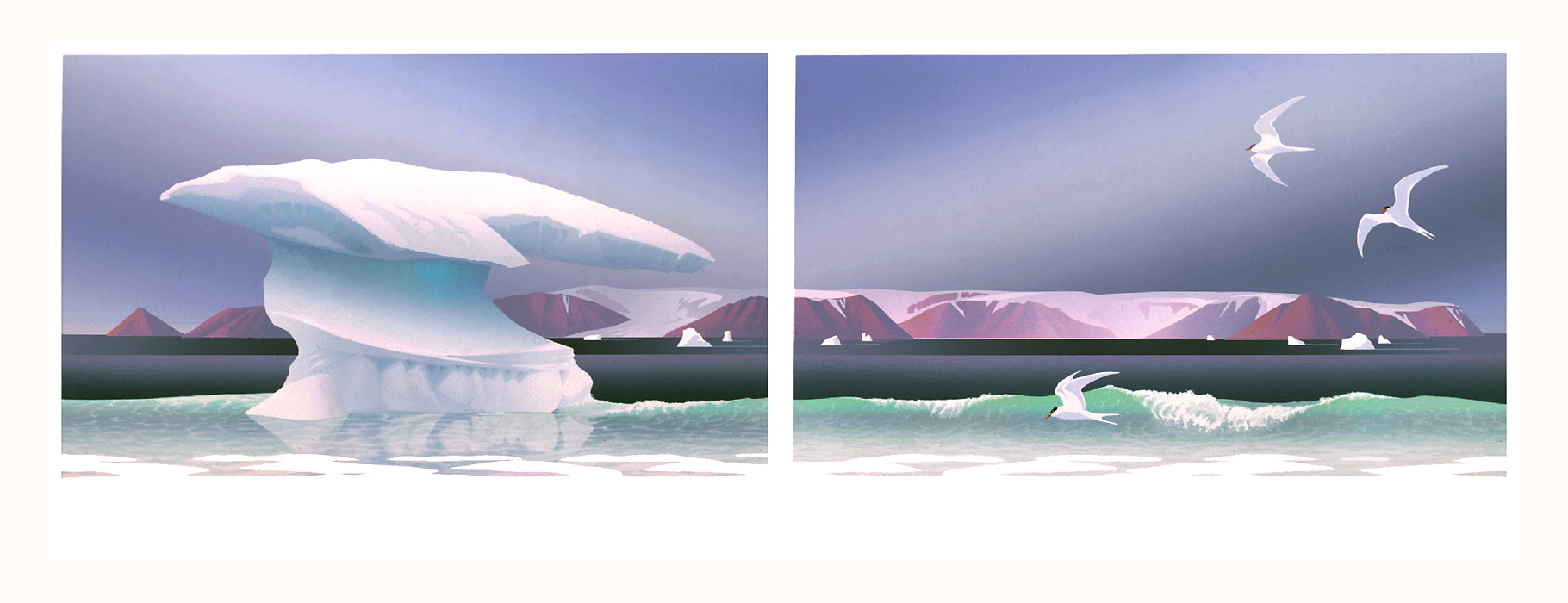 1987: Great Northern Divers and Rainbow Trout were conceived as a "vertical diptych" and these fish and birds are found throughout BC, so the landscape is pretty vague. Grise Fjord (triptych) was our largest piece to date, and depicts a sweeping view of the south coast of Ellesmere Island in the Canadian Arctic.