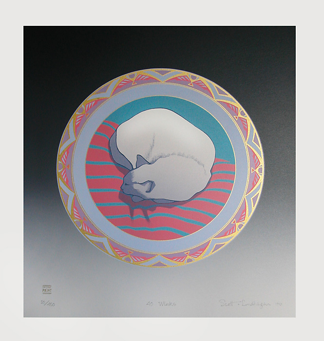 1990 Mandala Series: First Light Vancouver, Coastal Islands, Orca Cavort, Terra Bovinica, Forty Winks, Evening Rounds, Kluane. These images were all in the circular frame, in State 1, and some of them feature "spontaneous squeegee effects" in the background areas! ( We invented that term)