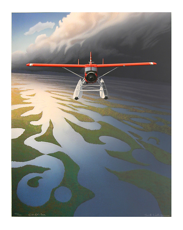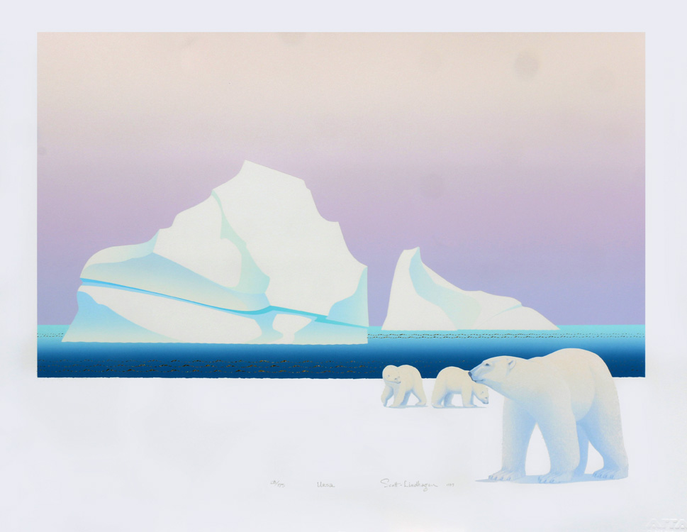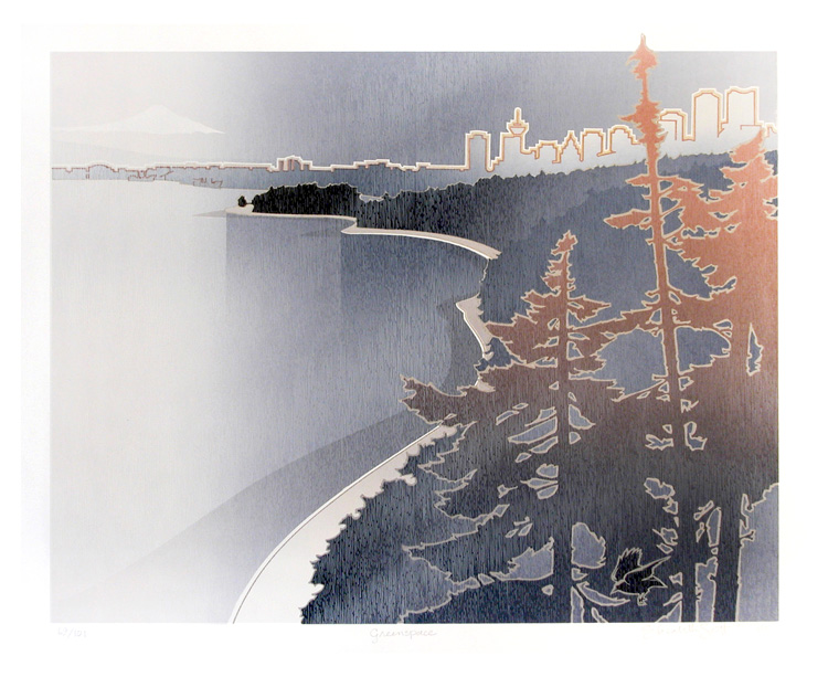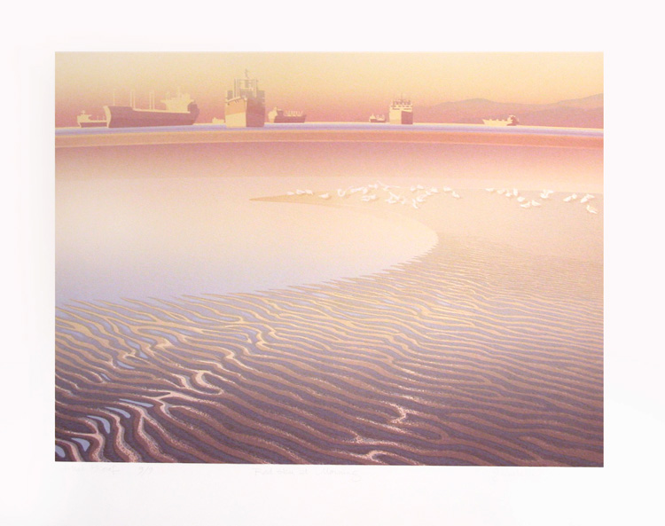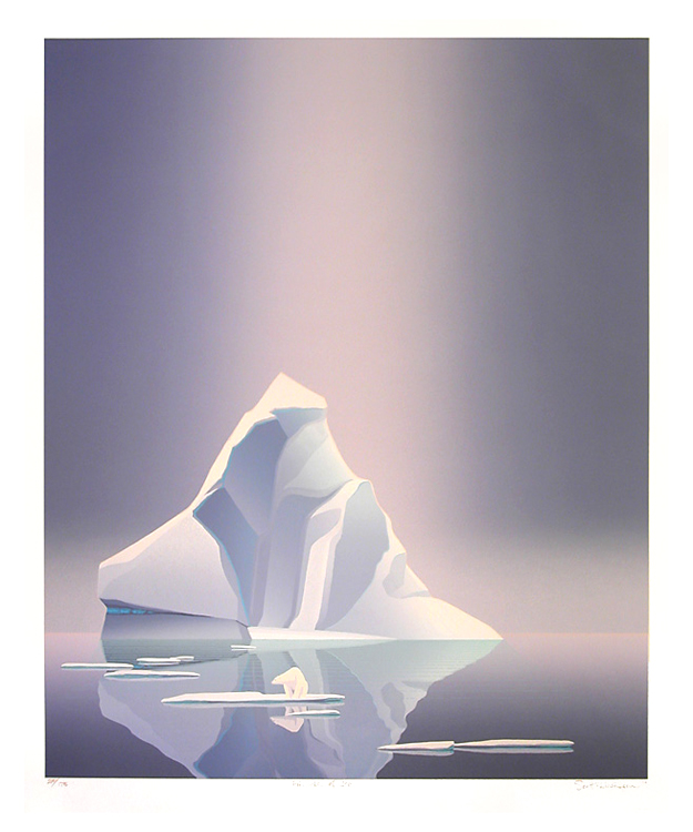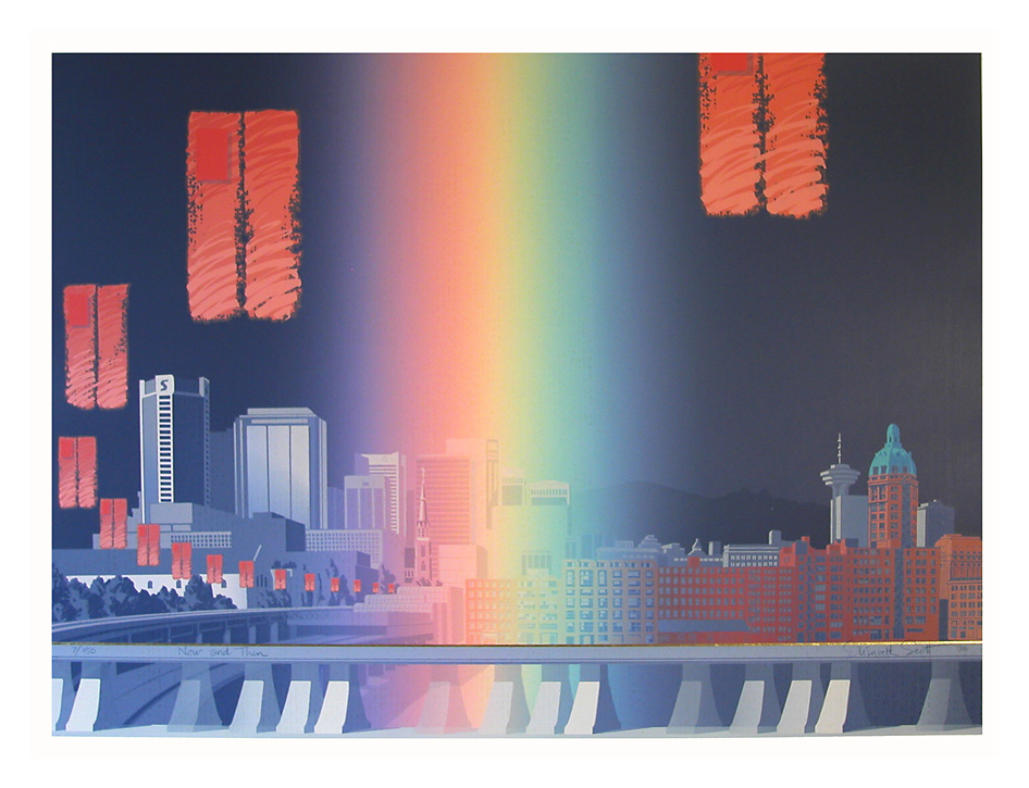1986: Out of the Sun was created to feature the Arctic landscape from the air. Large works are more difficult to do with silkscreening, but they have a certain power and allure, so in 1986 we worked large: completing Now and Then (Vancouver) , Through the Narrows to the Open Sea ( the Lions Gate Bridge), add Inner Harbor , also known as "Coal Harbour" in Vancouver. It was the year of Expo 86 in Vancouver, and we thought we might be exposed to a larger clientele that year, but it seemed that all the shops were a "closed shop" and our works did not find a space inside the World Exposition. Rats !