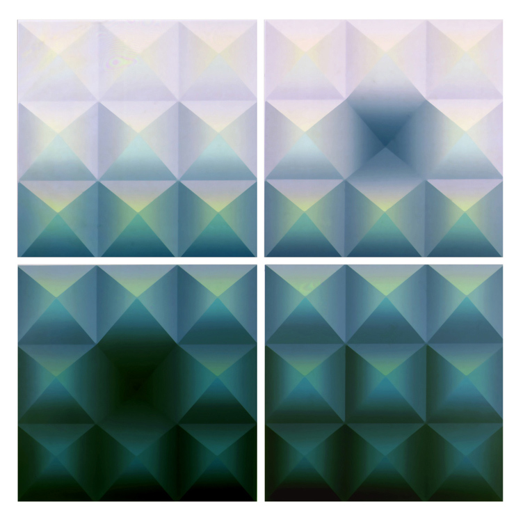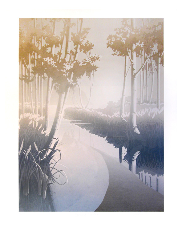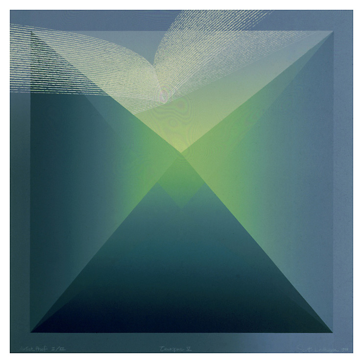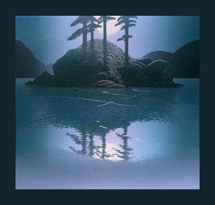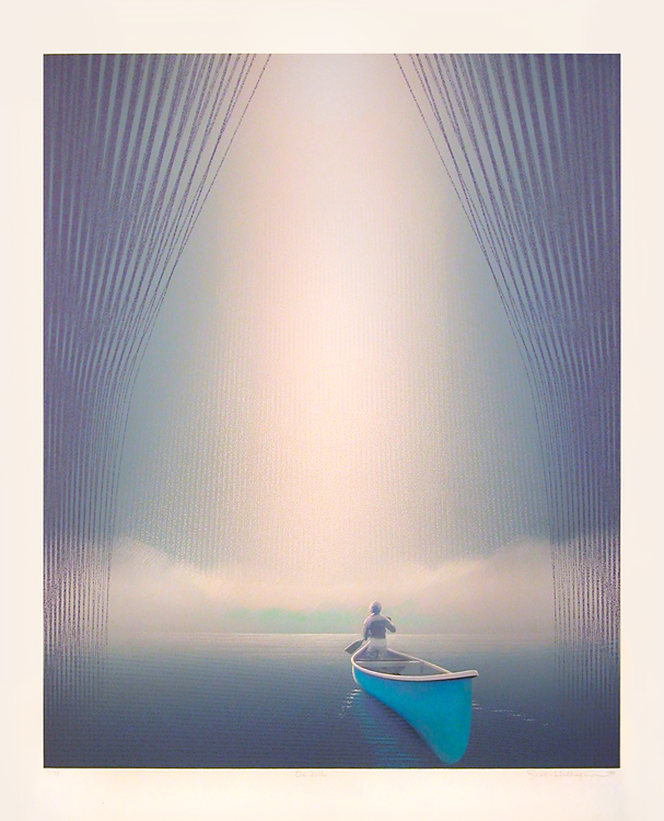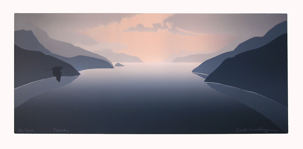 1990 was a year of experimentation with what screen printing was best at: gradations: Transpace I-V feature gradations to create an impression of 3D. Out of the Blue, Whispering Sea (diptych), Islet, The Fall, Strait of Georgia, Haven each in their own way stretched our capabilities with texture through silk screening, and further use of gradation.